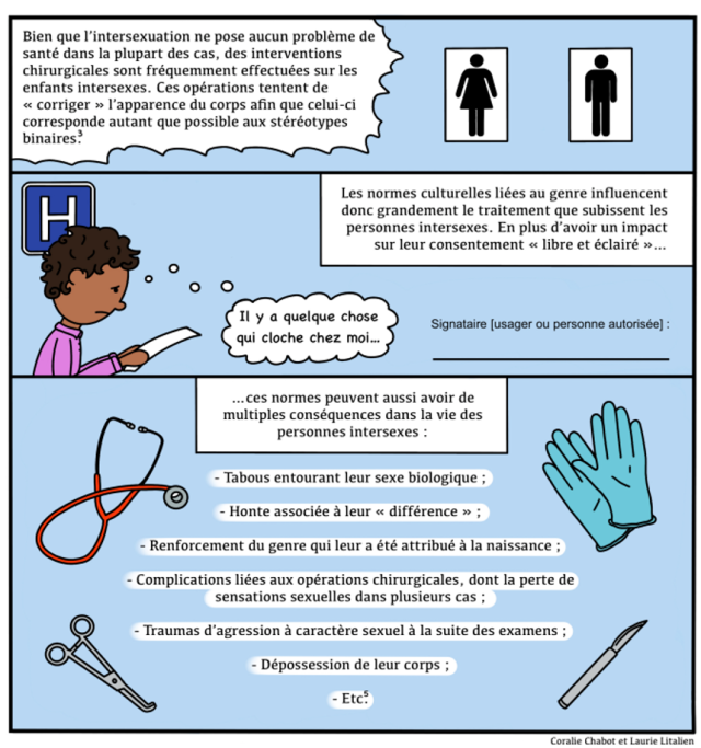 « L’intersexuation » est une bande-dessinée créée par Laurie Litalien en collaboration avec Coralie Chabot dans le cadre du troisième concours annuel de vulgarisation de Sciences 101. Leur BD apporte une définition scientifique à l’intersexuation : des personnes nées avec des caractéristiques sexuelles qui n’entrent pas dans le standard mâle/femelle.
