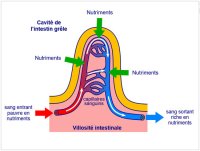 Le passage des nutriment dans le sang est une animation qui présente un schéma fonctionnel du passage des nutriments dans le sang au niveau d’une villosité intestinale de l’intestin grêle.