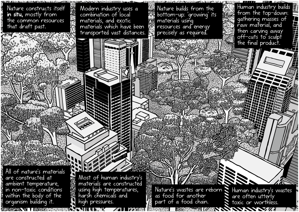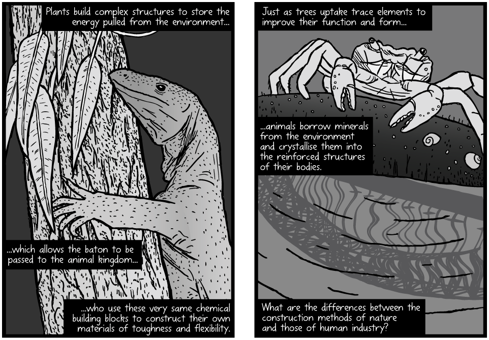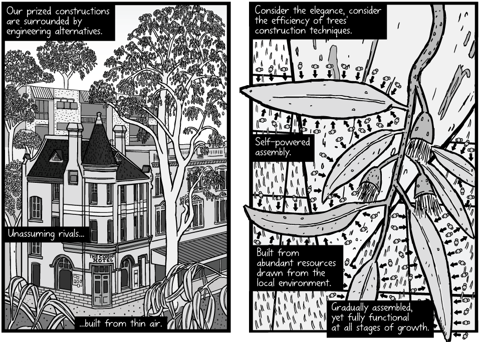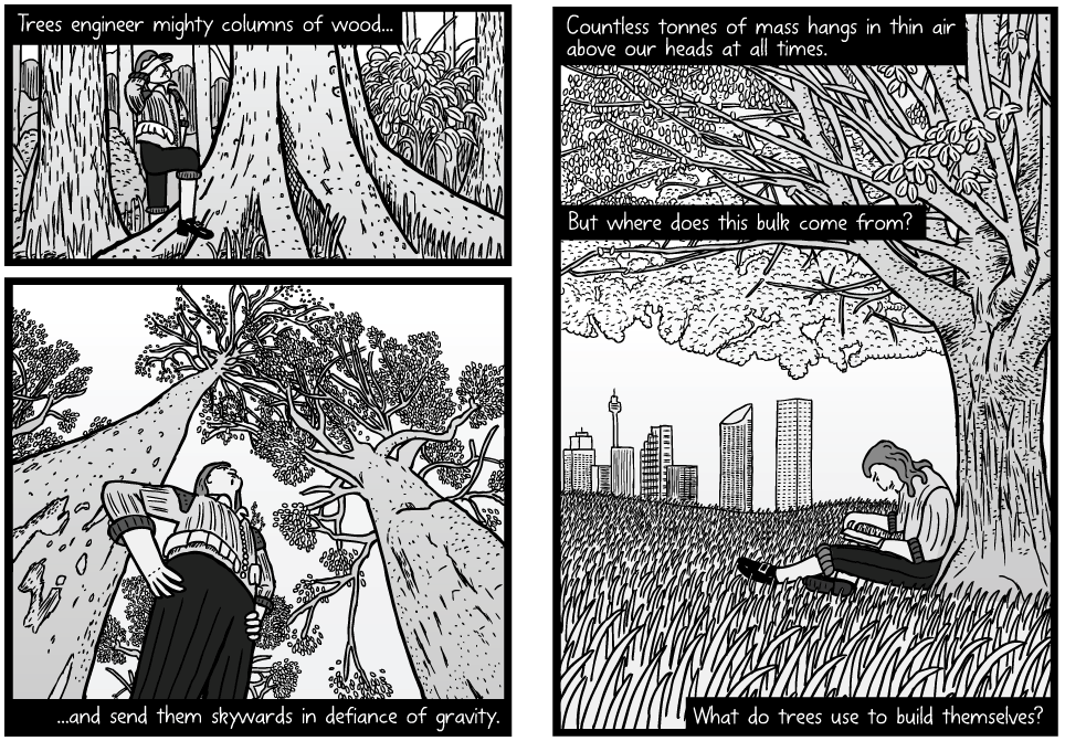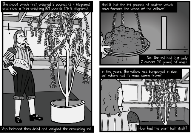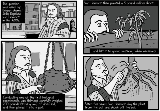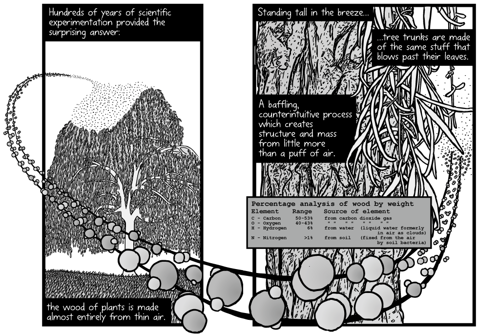 Les arbres se construisent à partir du carbone, de l’hydrogène et de l’oxygène de l’air ambiant. Pouvons-nous apprendre à copier leurs secrets d’ingénierie ? Cette BD en anglais sur le biomimétisme et l’expérience de Jan Baptist van Helmont permet de comprendre le processus de croissance et de fabrication de la matière organique par les arbres grâce à la photosynthèse.