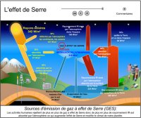 L’animation montre ensuite que l’augmentation des gaz à effet de serre due aux activités humaines (industrie, transport, déforestation...) renforce l’effet de serre, ce qui provoque un réchauffement climatique.