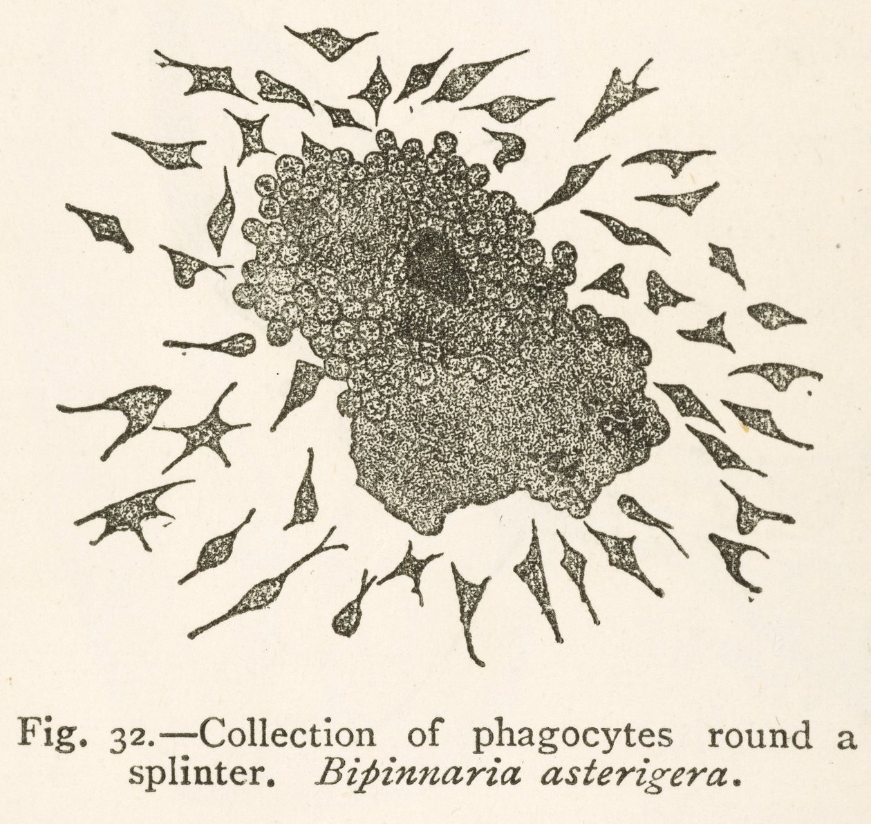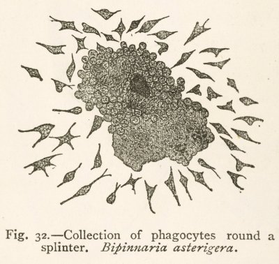 Dans son livre, Elie Metchnikoff raconte comment, en 1882 à Messine, il a introduit des épines de rosier dans des larves d’étoiles de mer (bipinnaria) très transparentes. Il y observe que certaines cellules mobiles, analogues à des leucocytes, se déplacent vers les épines, les entourent, et les pénètrent.