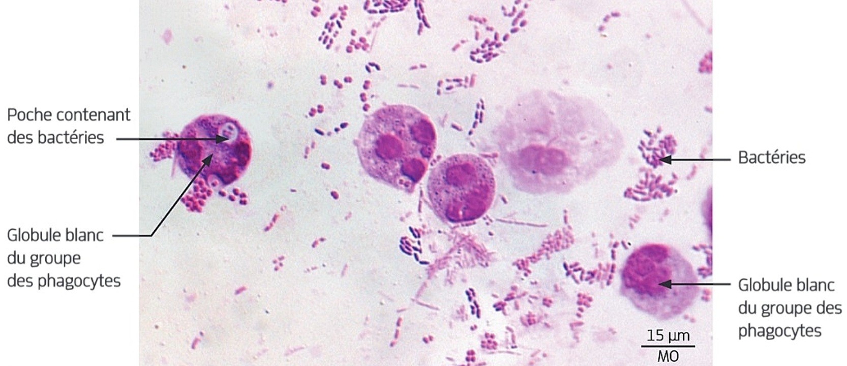 – Observation microscopique de pus formé par des phagocytes, des bactéries et de débris cellulaires :