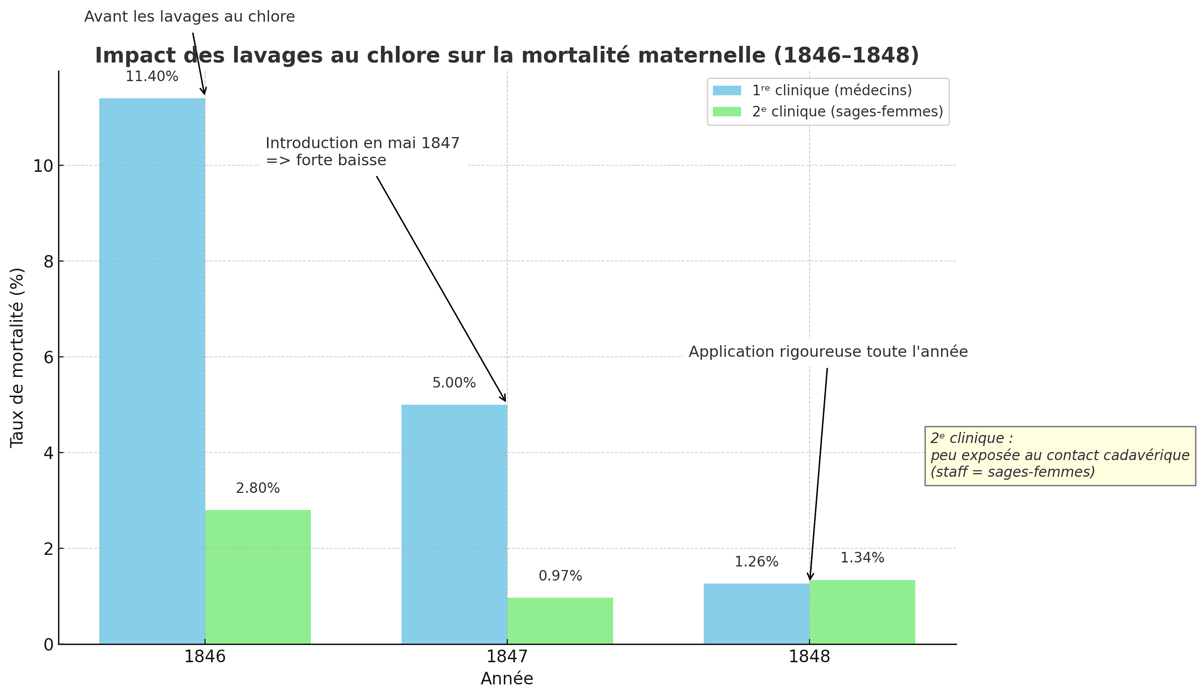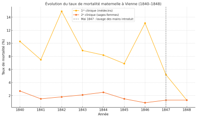 Ignace Philippe Semmelweis (1818–1865) était un médecin hongrois, souvent surnommé le "sauveur des mères". Dans les années 1840, alors qu’il travaillait à l’hôpital général de Vienne, il découvre que le taux élevé de mortalité par fièvre puerpérale (infection post-accouchement) pouvait être drastiquement réduit si les médecins se lavaient les mains avec une solution chlorée avant d’examiner les patientes.