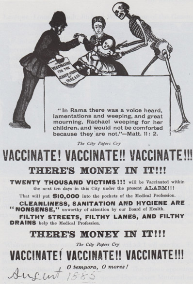 Cette affiche date probablement du XIXᵉ siècle (1850s) et illustre la forte opposition de certains groupes à la vaccination obligatoire contre la variole, notamment dans le Royaume-Uni et aux États-Unis. À cette époque, plusieurs villes rendent la vaccination obligatoire pour tenter d’enrayer les épidémies de variole. Mais ces politiques suscitent une vive contestation : peur des effets secondaires, revendications de liberté individuelle, défiance envers les médecins et les autorités sanitaires.
